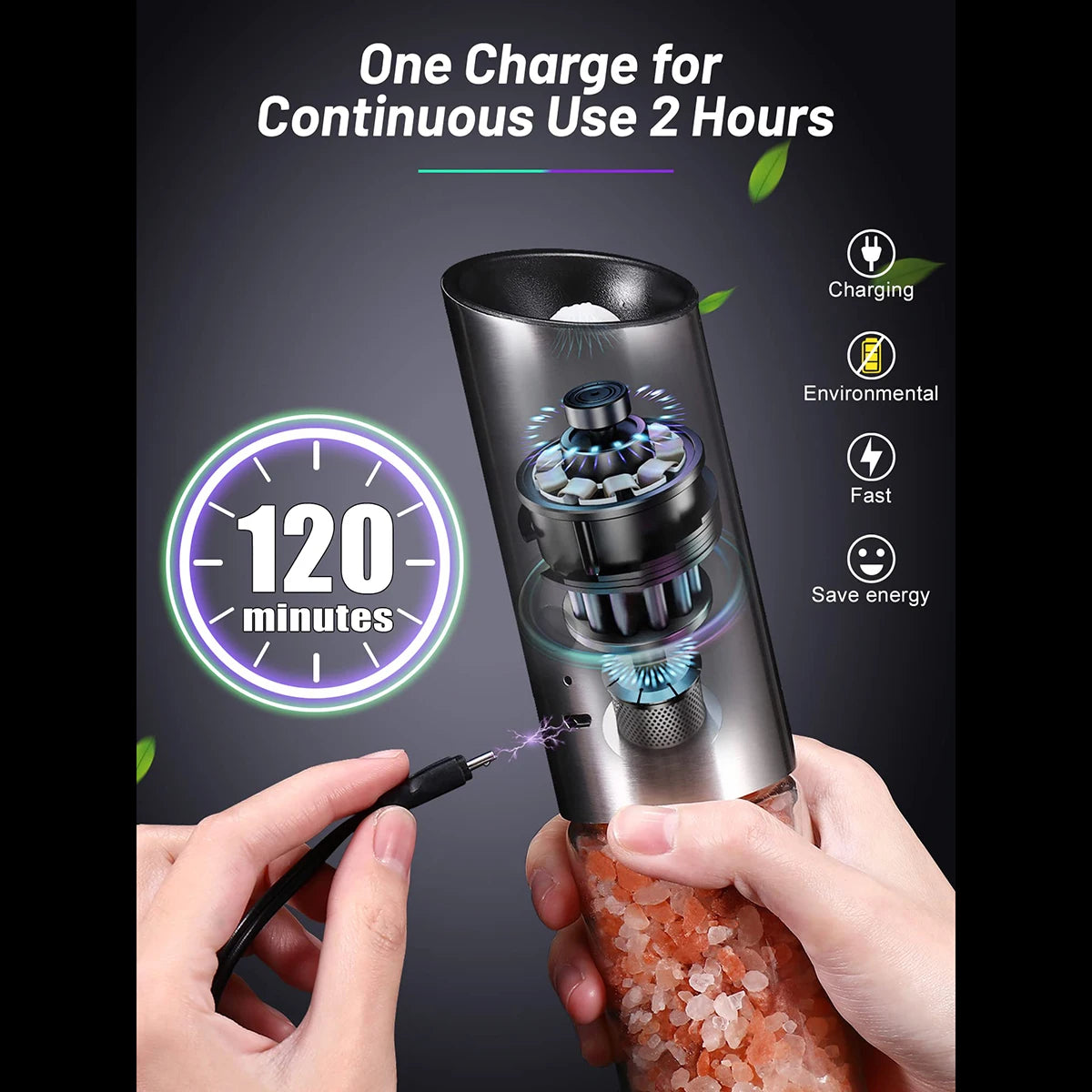 - USB rechargeable design lets you season without cords, keeping your counter clean, avoiding battery replacements, and making one-handed operation simple.