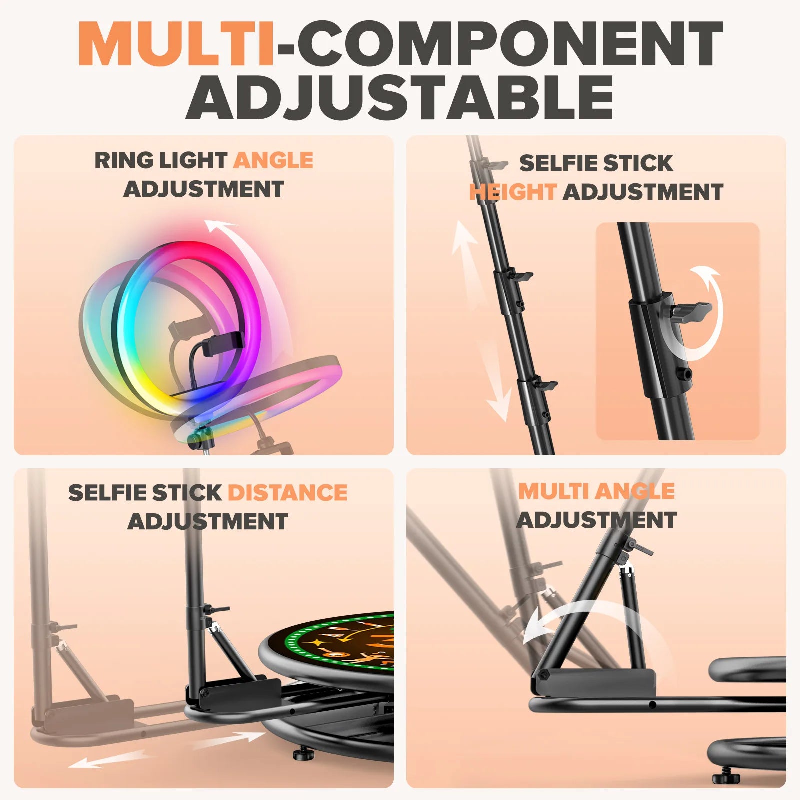 - RGB ring light provides studio-quality illumination for clear, vibrant footage.