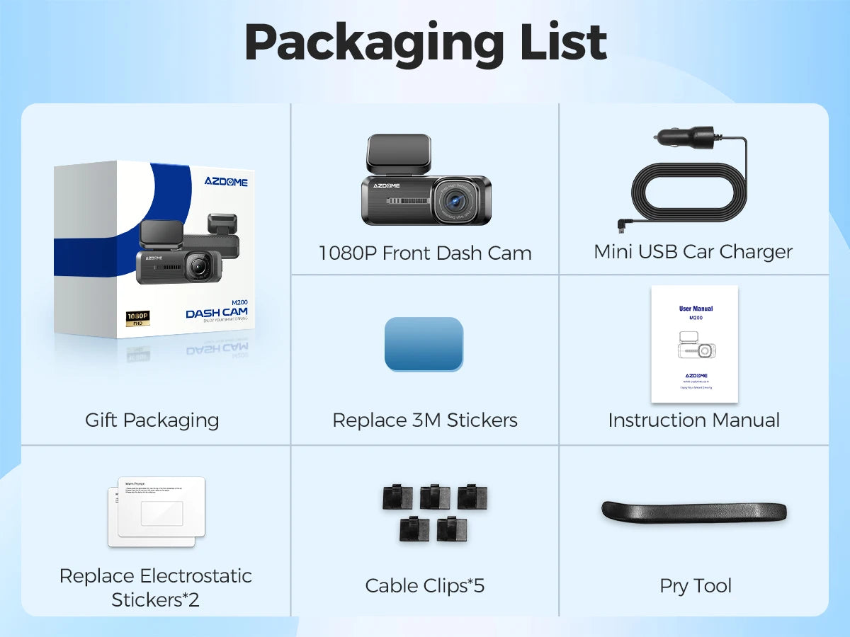 Meet the AZDOME M200 dash cam — a discreet, high-performance front-facing recorder built for modern drivers. Delivering crisp 1080P footage with a wide 150-degree field of view, it captures important details while maintaining a clean, low-profile installation. Control and review footage anytime with effortless APP access, thanks to built-in WiFi.