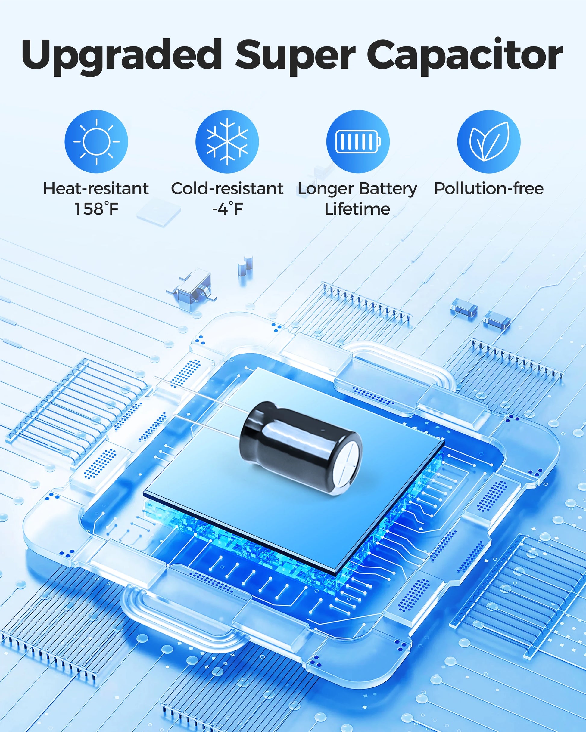 - Super capacitor power: No internal battery for greater durability and reliability in extreme temperatures.