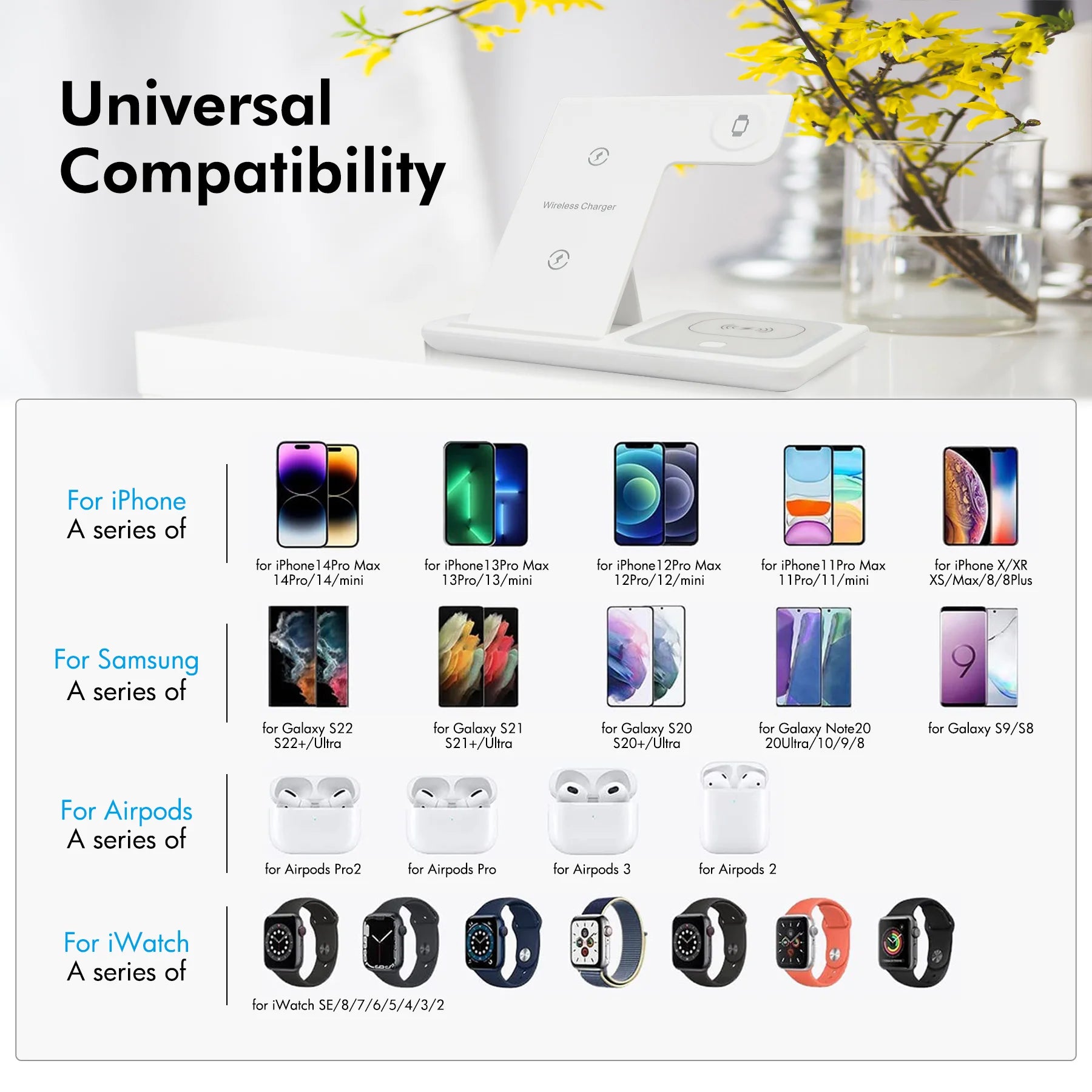 3-n-1 Wireless Charging Station: Charge for iPhone, Apple Watch, and AirPods simultaneously. It seamlessly powers for apple devices while keeping your space organized.